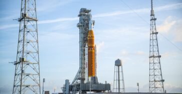 Media aim their remote cameras on NASA’s Artemis II Space Launch System (SLS) rocket and Orion spacecraft, atop a mobile…