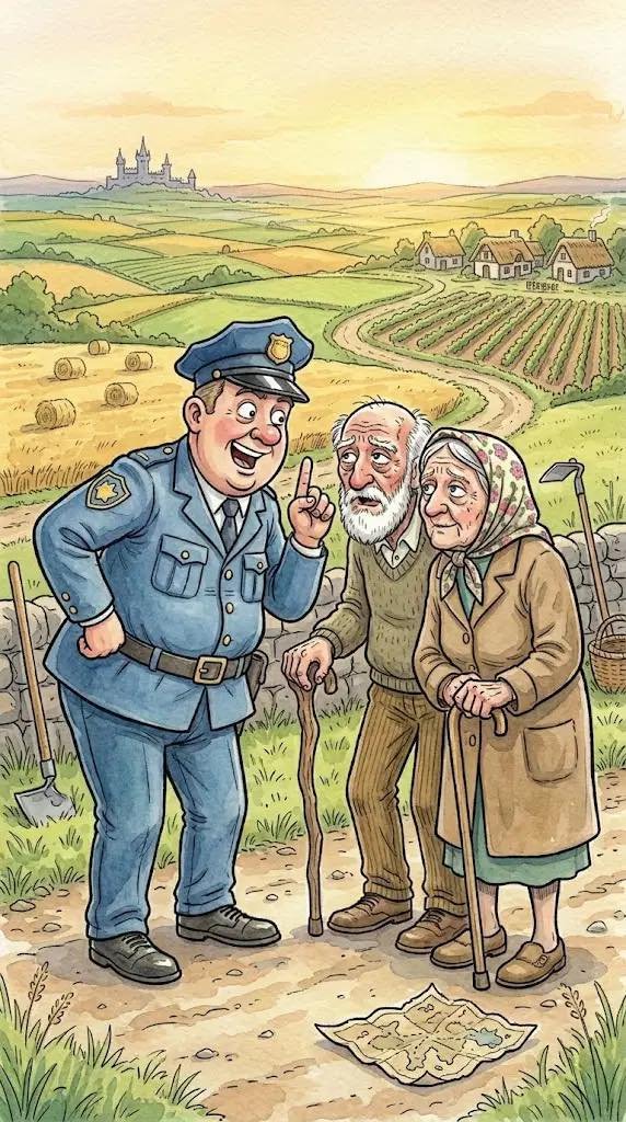The old lady lifts her skirt and the old man drops his L trousers. As she leans against the fence, the old man moves in Then suddenly they erupt into the most furious passionate love that the policeman has ever seen. This goes on for about ten minutes while both are making loud noises and moaning and screaming. Finally, they both collapse, panting on the ground.
