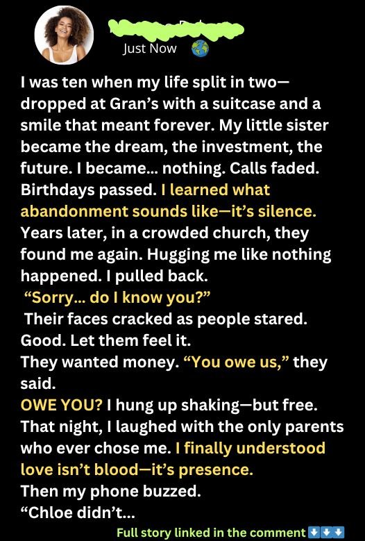 I was ten when my life split in two. One moment, I was unpacking my school bag, and the next, my parents rushed me into the car with a suitcase, promising we were going to Gran’s for “a little while.” I thought it was an adventure. I didn’t realize “a little while” meant forever.