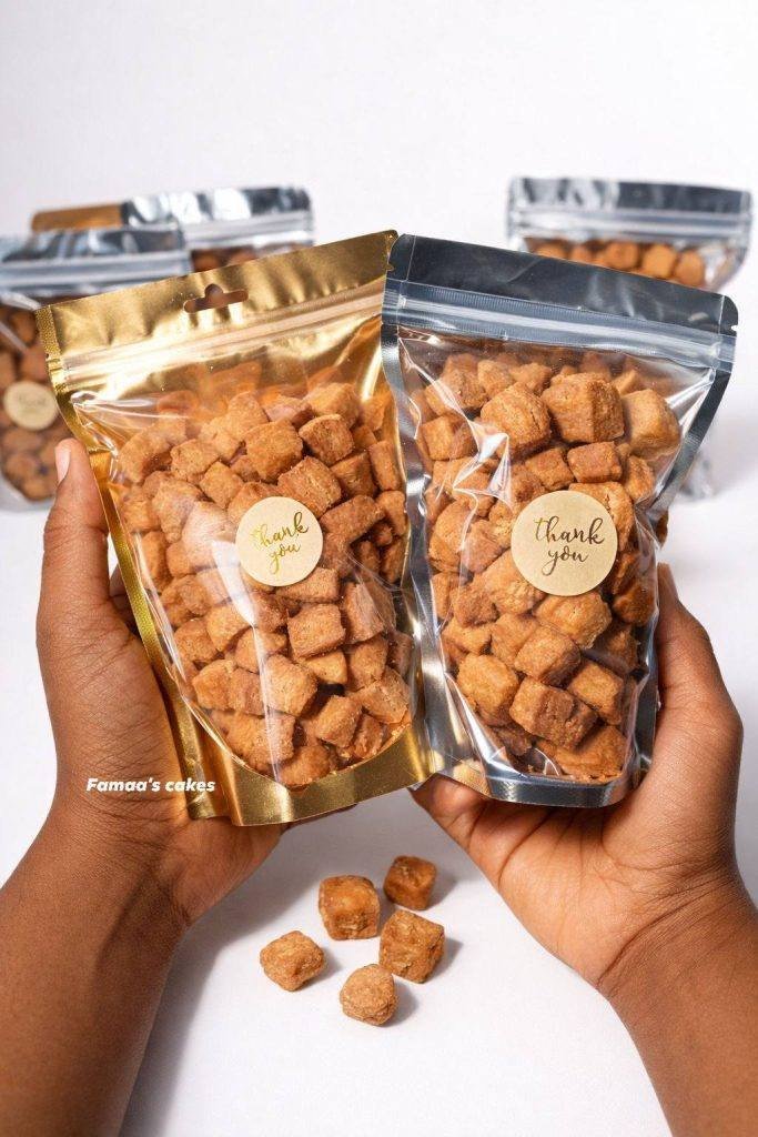 The packaging itself adds a touch of sophistication. With sleek metallic finishes and a clear front display, customers can instantly see the quality of the product inside. The “Thank You” label adds a personal and warm touch, making these snacks ideal for events, giveaways, or small business branding.