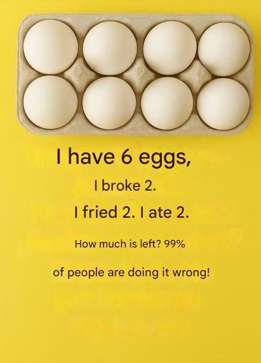 “I have 6 eggs. I cracked 2. I fried 2. I ate 2. How many eggs do I have left?”