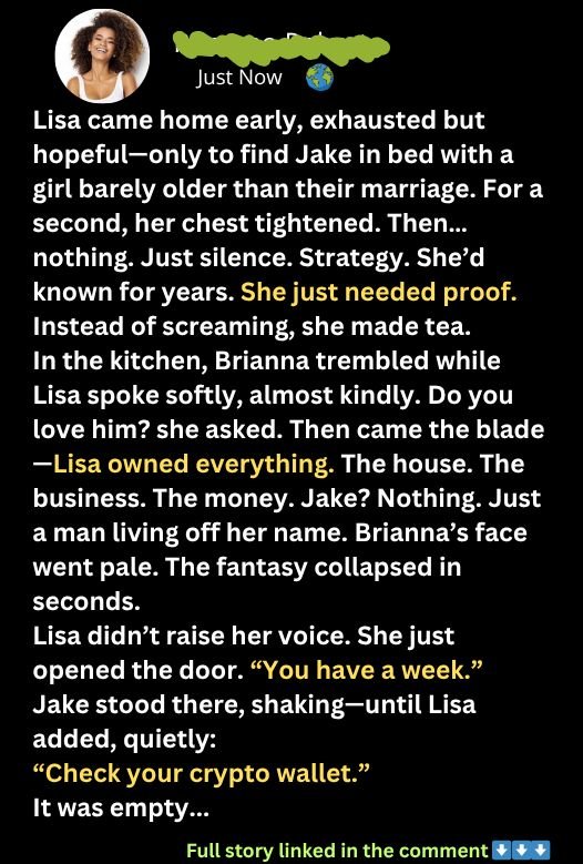 Lisa returned home early from a conference, only to find her husband Jake in bed with a woman half his age. But instead of rage, she responded with eerie calm—offering them tea. Her silence wasn’t weakness; it was strategy. For years, Lisa had suspected Jake’s betrayal. She’d married him knowing he valued security over love, and she protected herself with an ironclad prenup.