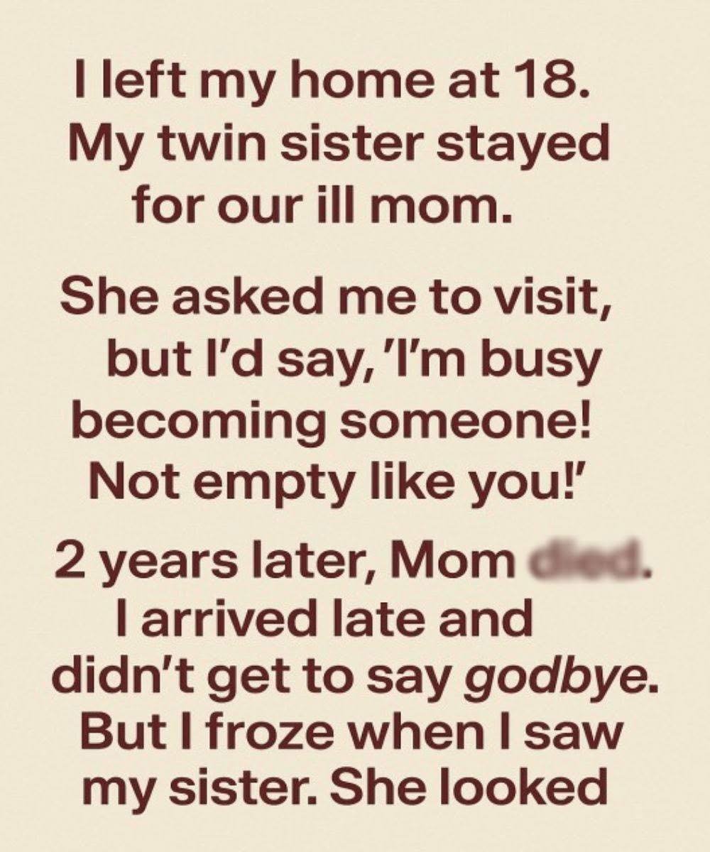 My twin sister chose to stay behind, knowing our mother’s health was already failing. She tried to tell me that caring for Mom mattered just as much as chasing ambitions, but I brushed her off with quiet arrogance. I told her I was “becoming someone,” as if staying somehow made her less.