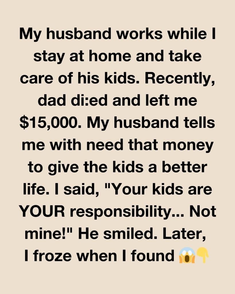 Recently, my dad di:ed and left me a $15,000 inheritance, and my husband tells me we need the money to give the kids a better life. I told him, “Your kids are your responsibility… Not mine! It’s NOT my responsibility to provide for them!”