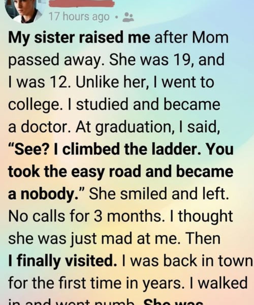 At the time, I didn’t realize those words would stay with me for years. After our mother passed, my sister stepped into a role she never asked for. At only nineteen, she gave up her own dreams to take care of me. She worked long hours, managed endless responsibilities, and made sure I had everything I needed to focus on school. While I was chasing my future, she was quietly holding our world together.