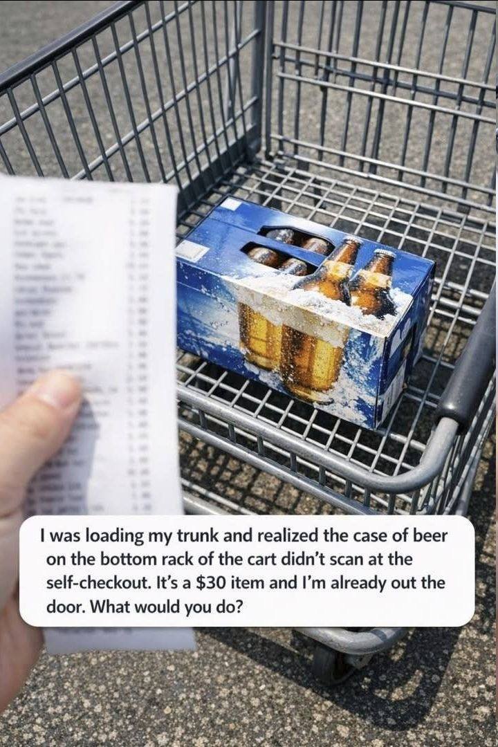 In the age of self-checkout, the convenience of quickly scanning and bagging your own groceries can sometimes lead to unexpected dilemmas. Imagine this scenario: you’ve just finished loading your trunk with bags of groceries when you notice that a $30 case of beer on the bottom rack of your cart didn’t get scanned. You’re already out the door—what do you do?