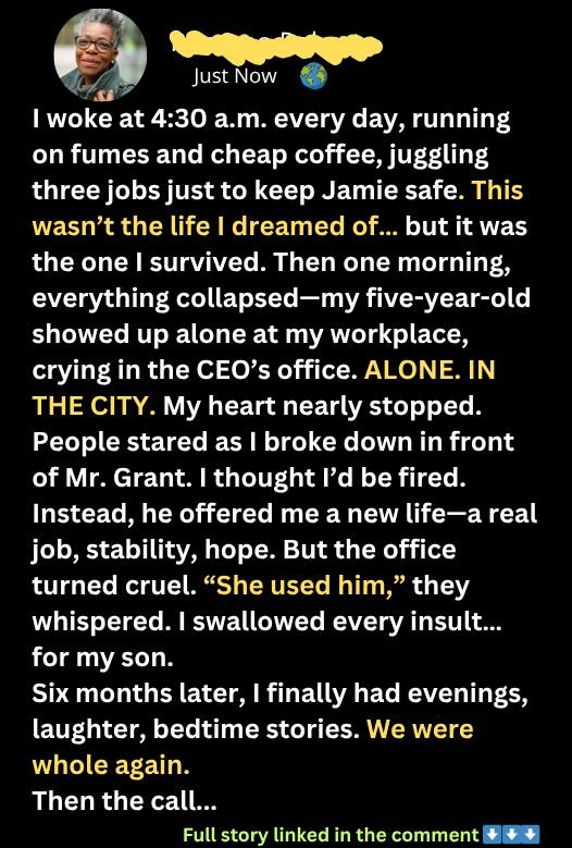 Mr. Grant explains Jamie arrived 30 minutes ago, asking to see his mommy who works too hard. Jamie remembered I worked in the tallest building downtown. He told security I cleaned offices for important people. I’m stunned. My son navigated public transit and corporate security just to be with me. “You leave before I wake up,” he whispers. “I just wanted lunch like Tommy’s mom does.” Mr. Grant asks how many jobs I work. “Three,” I admit. “And how much time do you spend with your son?” “Not enough,” I say, tears threatening to spill.