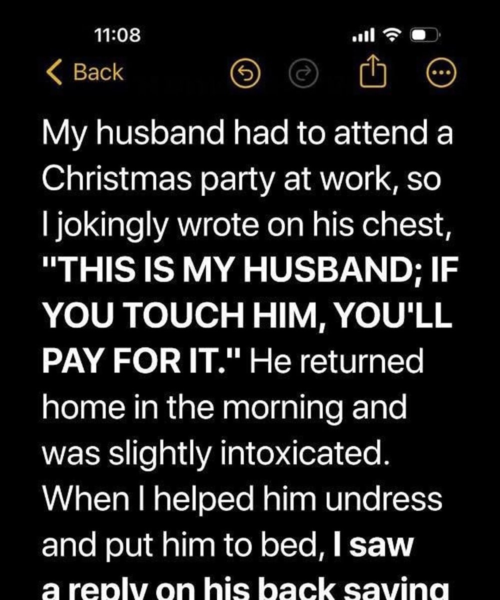 It began as a harmless joke—a playful note I wrote before my husband left for his office Christmas party. I had no idea that the message on his chest would set off a chain of events that would completely change how I saw our marriage.
