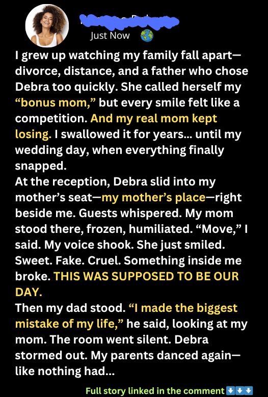 I confronted her, told her to stop humiliating my mom. My dad brushed it off, saying I was “too sensitive.” But Debra’s sabotage continued—mocking my mom behind her back and pushing herself into every milestone. When I got engaged, I begged my dad to make sure Debra wouldn’t cause drama at the wedding. He promised. He didn’t deliver.