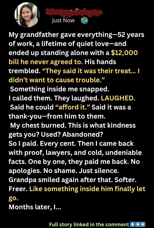 He was supposed to be honored, not abandoned. But my 74-year-old grandfather stood alone at checkout, holding a $12,000 bill he never agreed to. They thought he’d stay quiet—until I showed up.