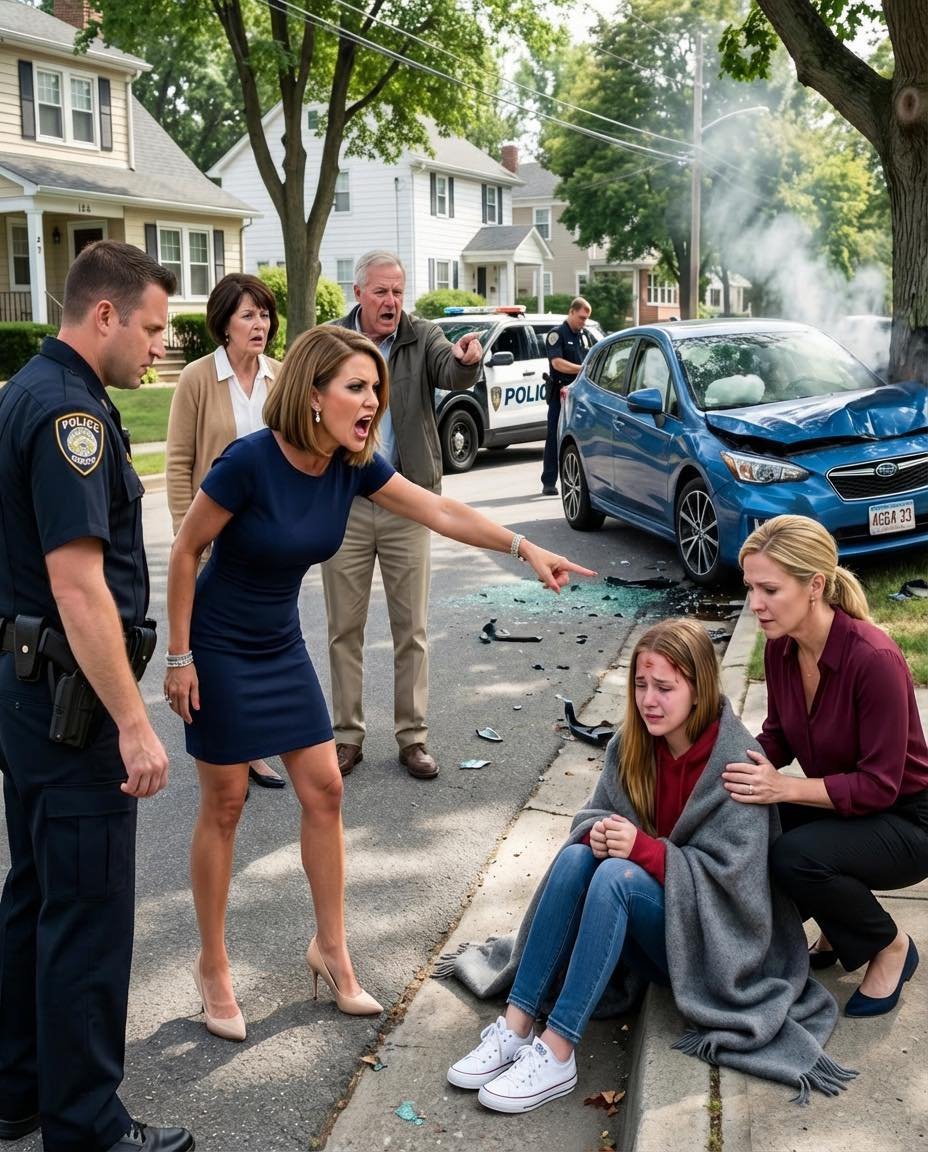 My fifteen-year-old daughter, Emily, sat on the curb wrapped in a gray emergency blanket, a cut across her forehead and shards of glass tangled in her hair. Her brand-new blue Honda Civic—the one I had bought just two weeks earlier after years of saving, the one she wasn’t even fully licensed to drive alone yet—was crushed against an oak tree at the edge of Willow Creek Road. Steam rose from the wrecked hood. One headlight flickered weakly, like the car itself was struggling to stay awake.