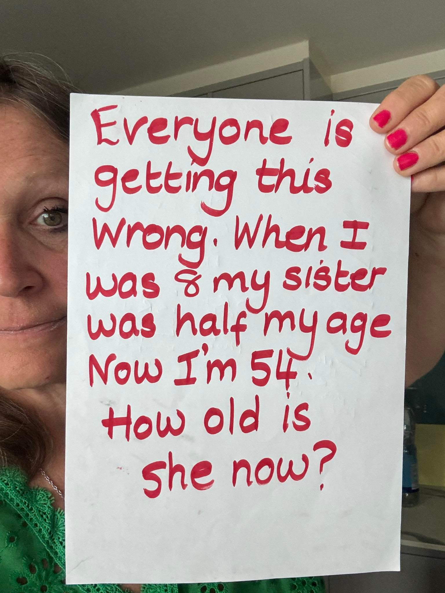 “When I was [age], my sister was half my age. Now I’m 54. How old is she now?”