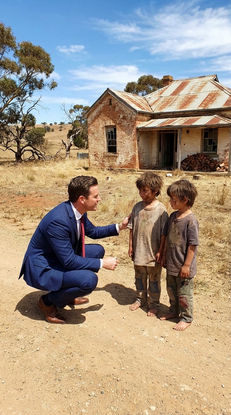 In front of a small, unplastered brick shack, under a harsh sun and a hot wind that whipped up red dust, stood two identical children, thin, covered in dirt, their clothes worn thin from too many days of the same thing. They didn’t speak. They just stared at him.