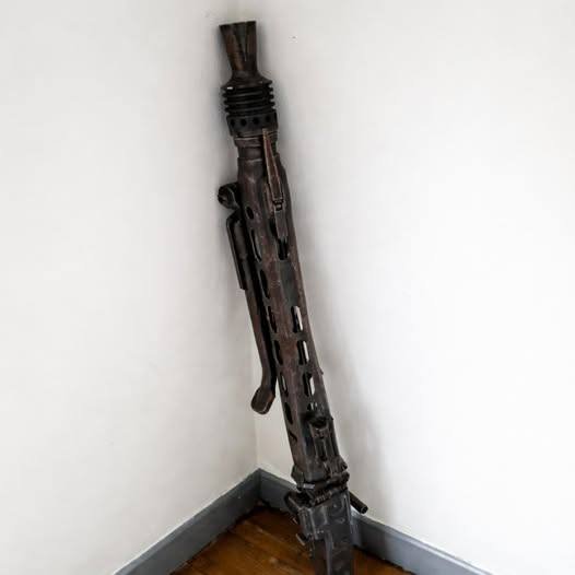 - A long, dark metal firearm leaning in a corner, with a perforated barrel jacket/shroud and visible folded bipod hardware near the front area.