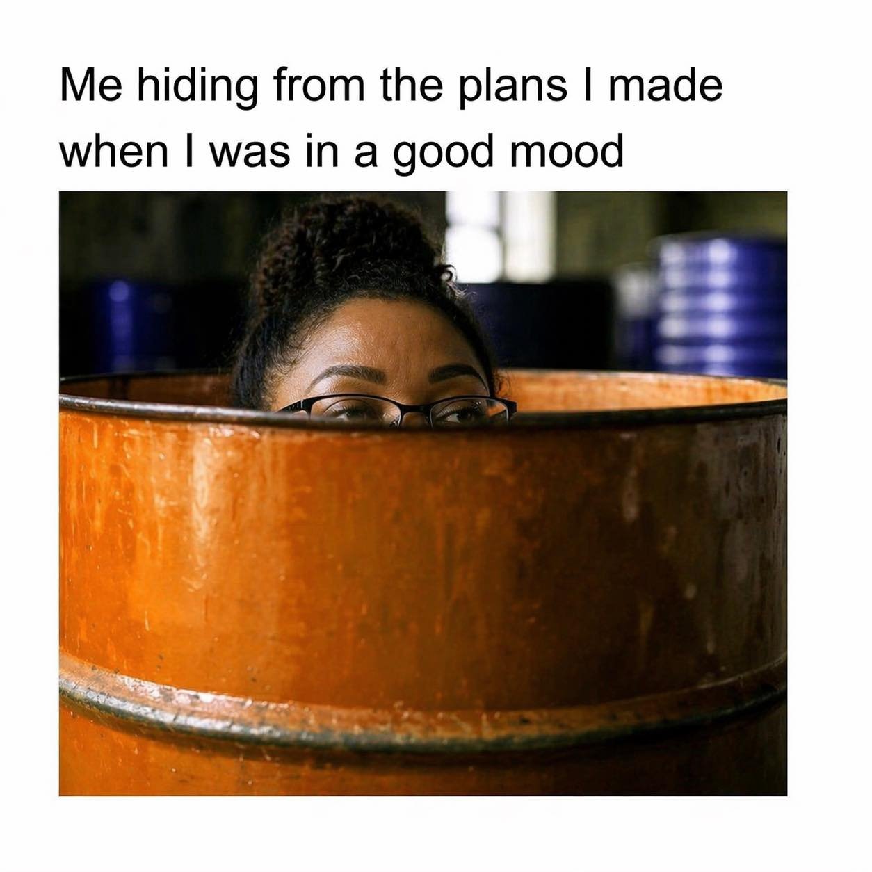 But later, when that energy fades, those same plans can feel overwhelming. Suddenly, instead of chasing them, we feel like hiding from them—just like the person in the image peeking from behind a barrel.