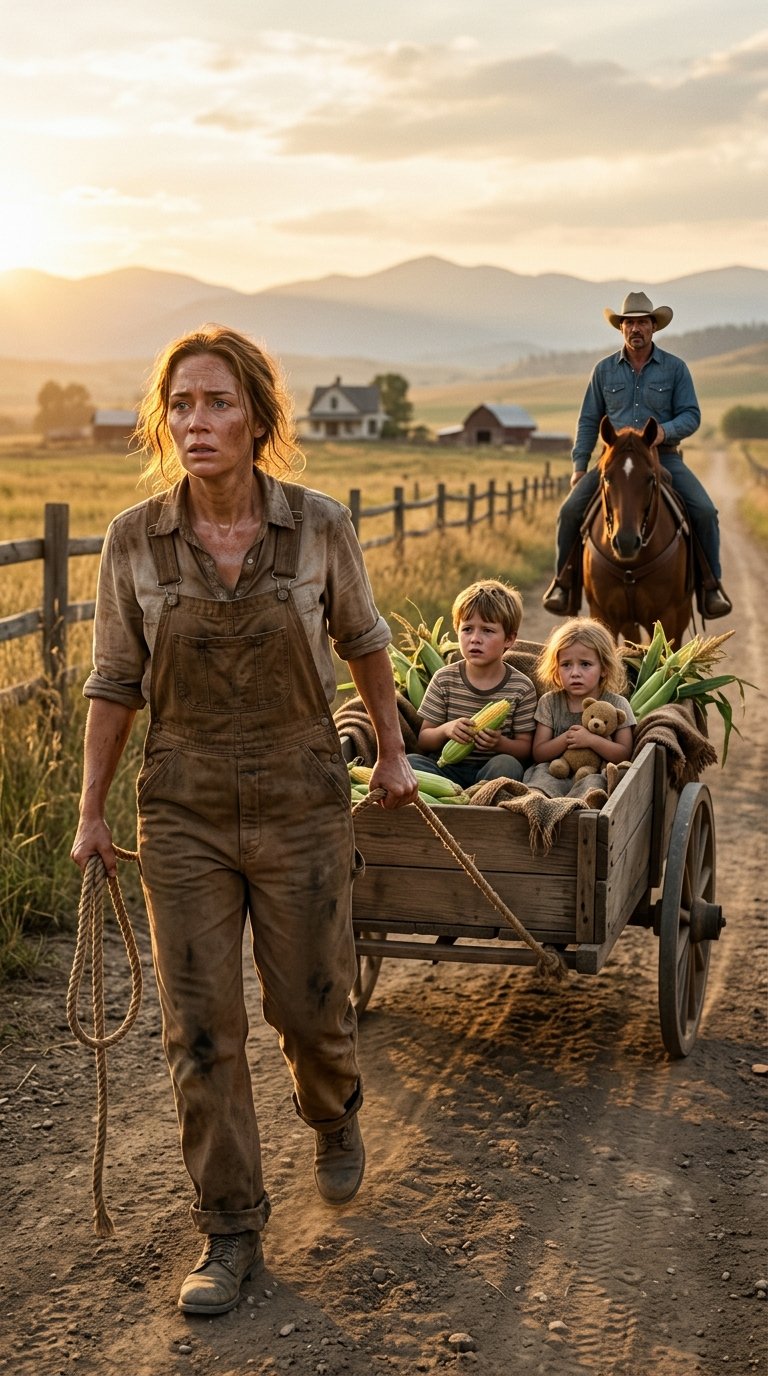 Inside the cart, two young children sit close together: a boy holding fresh corn and a little girl clutching a teddy bear, both looking worried and confused. The cart is filled with harvested corn, adding rustic detail.